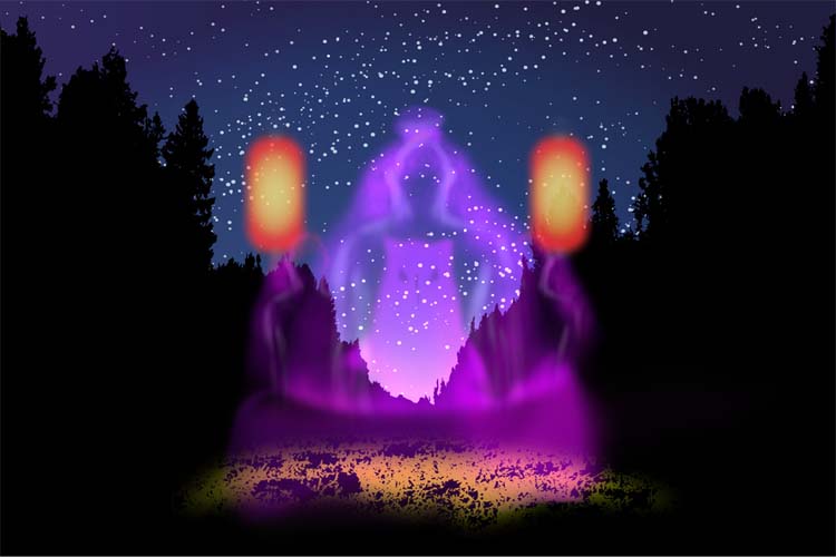 Staring intently, he saw the lights came from a tall, stretched lantern. Behind it rode a deity upon a great black horse, accompanied by several attendants on either side.